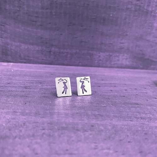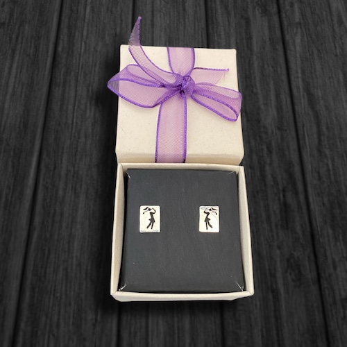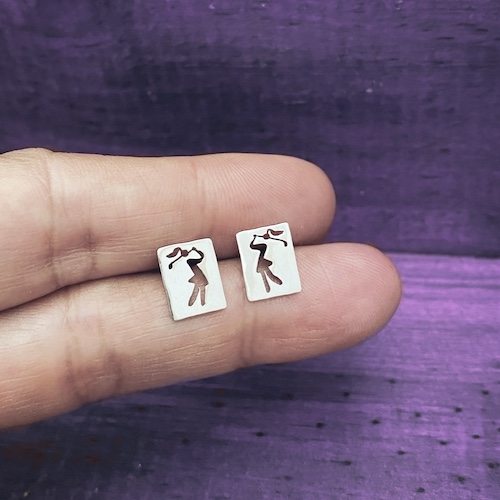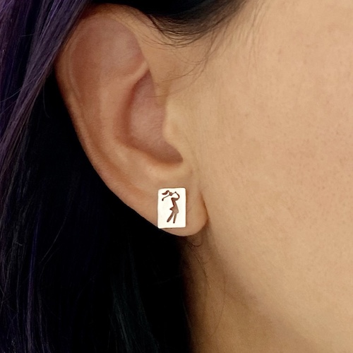 Par de aretes en plata 925 de 1 cm aproximadamente, hecho a mano artesanalmente con el diseño rectagular de una mujer golfista.