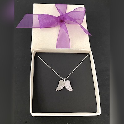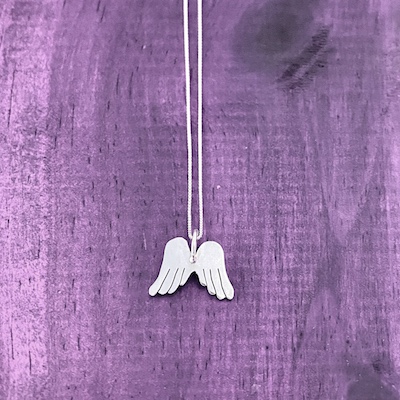 Dije en plata 925 de 2,2 cm aproximadamente, hecho a mano artesanalmente con el diseño de unas alas de Angel verticales, con cadena delgada también en plata925 de 45 cm.
