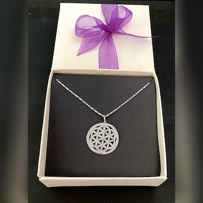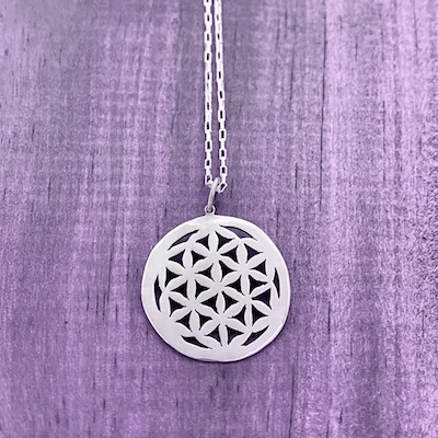 Dije en plata 925 de 2,8 cm aproximadamente, hecho a mano artesanalmente con el diseño del la Flor de la Vida, con cadena también en plata925 de 45 cm.