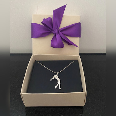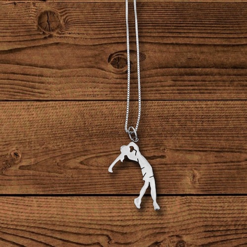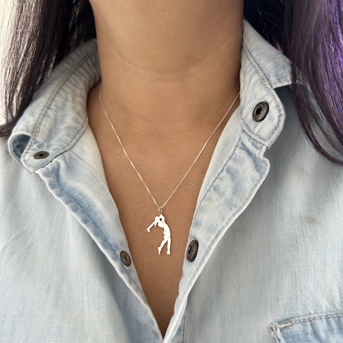 Dije en plata 925 de 2,2 cm aproximadamente, hecho a mano artesanalmente con el diseño de la silueta de una mujer golfista. Con cadena delgada también en plata925 de 45 cm.