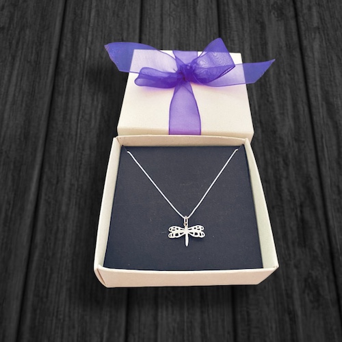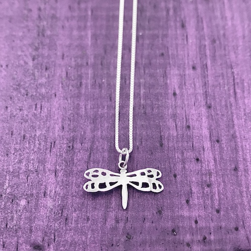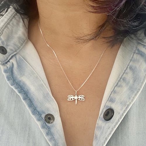 Dije en plata 925 de 1,8 cm aproximadamente, hecho a mano artesanalmente con el diseño de una libélula, con cadena delgada también en plata925 de 45 cm.