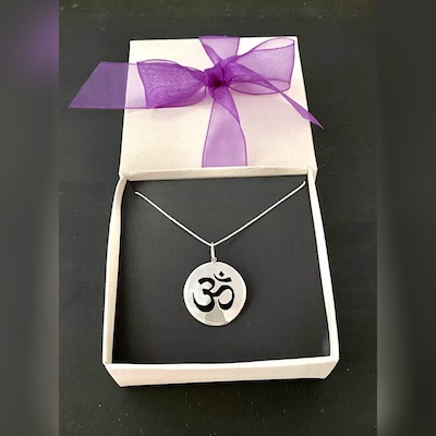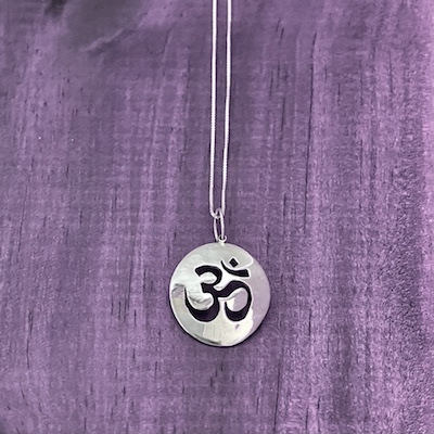 Dije en plata 925 de 2,2 cm aproximadamente, hecho a mano artesanalmente con el diseño redondo del Simbolo OM, con cadena delgada también en plata925 de 45 cm.