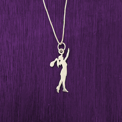 Dije en plata 925 de 2,5 cm aproximadamente, hecho a mano artesanalmente con el diseño de la silueta de una mujer tenista. Con cadena delgada también en plata925 de 45 cm.