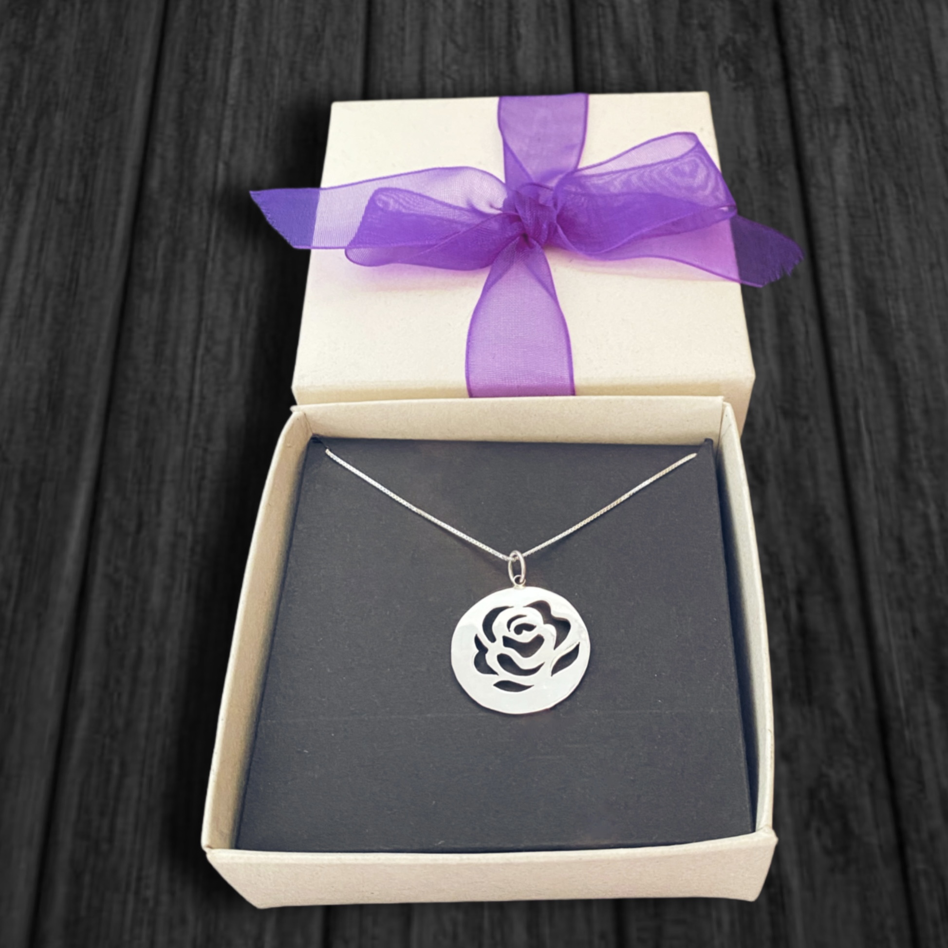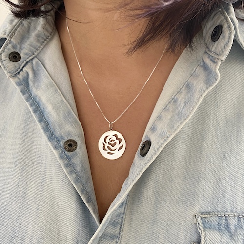 Dije en plata 925 de 2,2 cm aproximadamente, hecho a mano artesanalmente con el diseño redondo de una rosa con cadena delgada  también en plata925 de 45 cm.