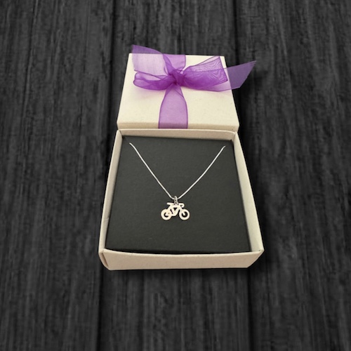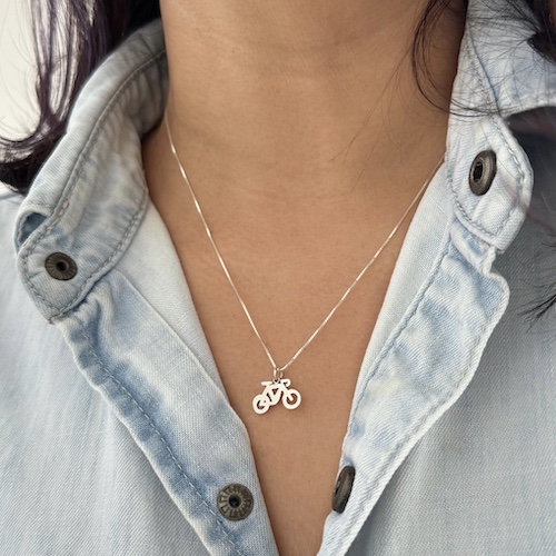 Dije en plata 925 de 1,5 cm aproximadamente, hecho a mano artesanalmente con el diseño de una bicicleta. Con cadena delgada también en plata925 de 45 cm.